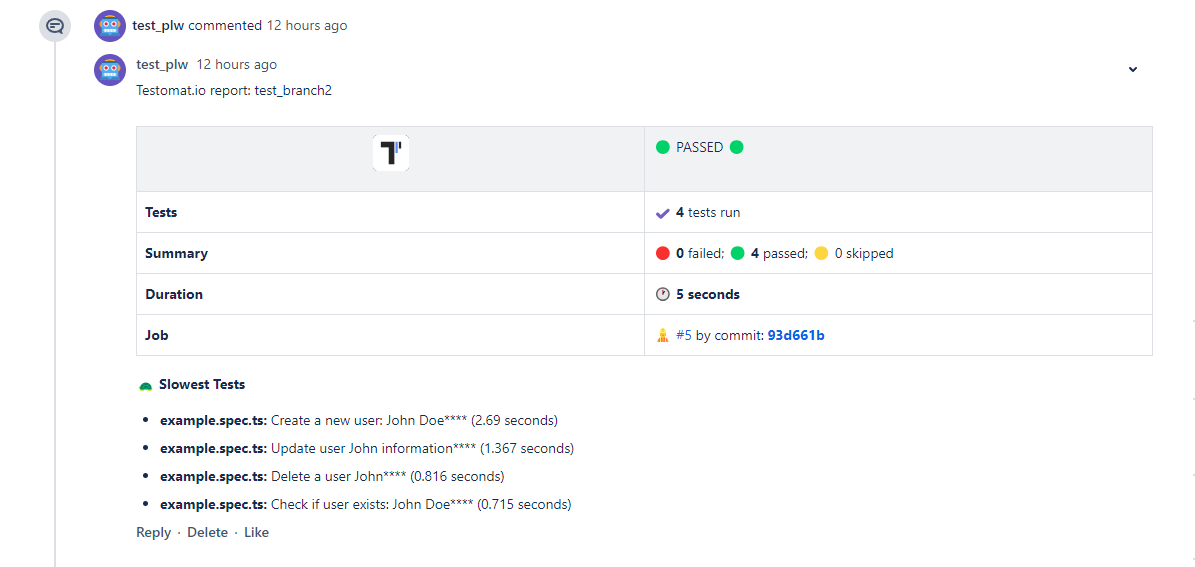 Section titled “Bitbucket Pipe”Bitbucket Pipe adds a comment with a summary of a run to a Pull Request: